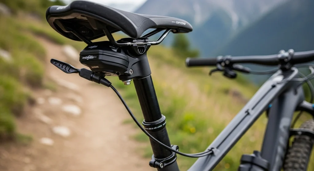 Picture sitting in your desk chair, changing its height without standing up – that smooth shift is what a dropper post brings to mountain bikes. Pressing a small lever on the handlebars raises or lowers the saddle right away. This lets you adapt quickly when the trail changes shape beneath you.